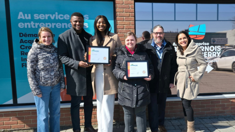 De gauche à droite : Audray Lemieux, directrice du développement du territoire à la MRC de Beauharnois-Salaberry, Leonel Saha, vice-président Braidsbook, Laetitia Tekam, présidente Braidsbook, Annie Perron, présidente LogiXpert Solutions inc., Yann Langevin, vice-président LogiXpert Solutions inc., et Sara da Cruz, responsable locale du Défi OSEntreprendre et conseillère aux entreprises à la MRC de Beauharnois-Salaberry