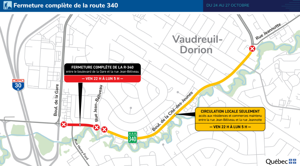 Le ministère des Transports et de la Mobilité durable informe la population qu’un tronçon de la route 340 (boulevard de la Cité-des-Jeunes), à Vaudreuil-Dorion, sera fermé pendant la fin de semaine du 24 au 27 octobre.